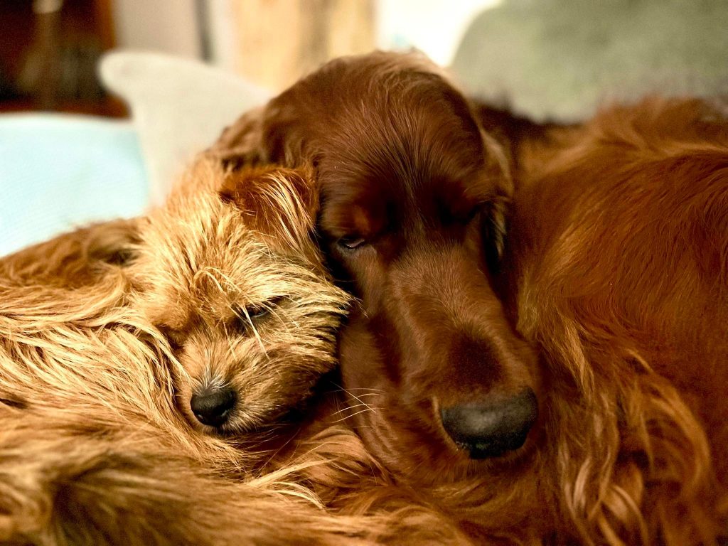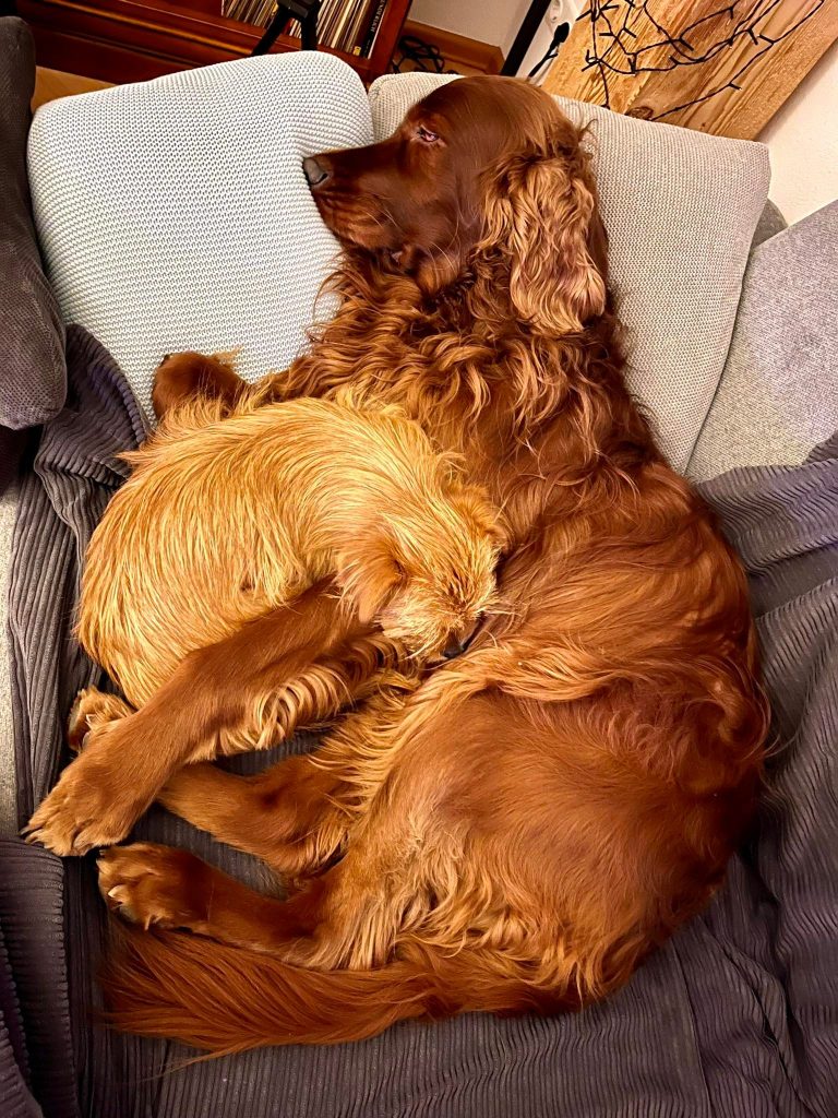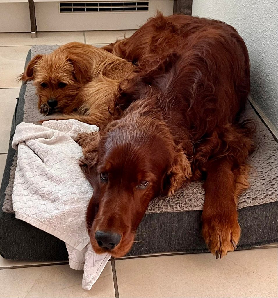 2022 haben wir den kleinen Benito (jetzt heißt er Schimi) in eine wundervolle Familie vermittelt. Als Kumpel hat dort ein großer Irish Setter auf ihn gewartet – nun sind sie ein zuckersüßes Paar.
