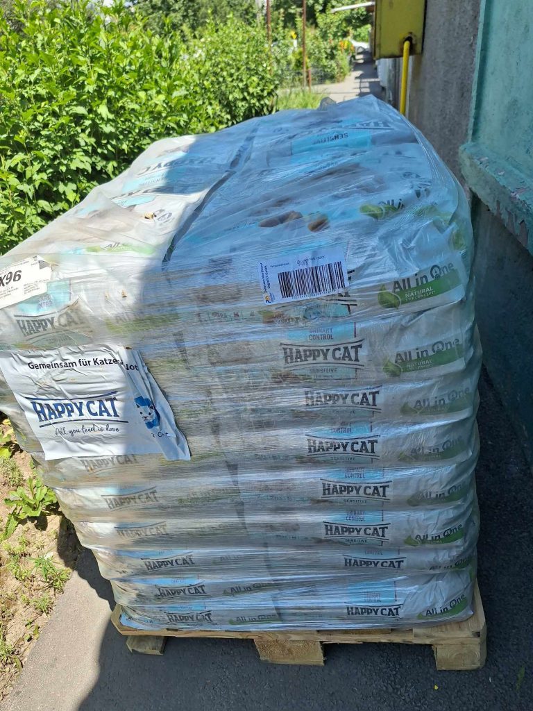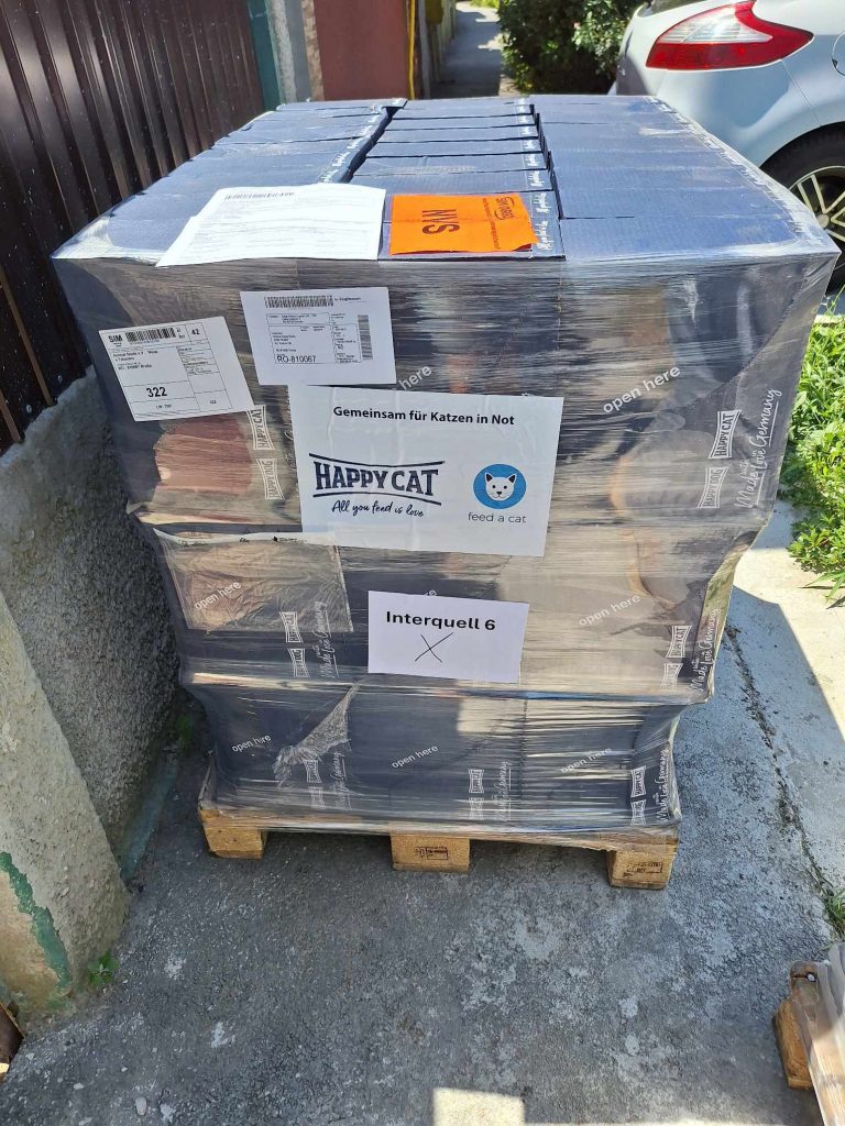 Unsere „Futternäpfe“ (Futterspenden in der Feed a Cat – App) waren zu diesem Zeitpunkt noch nicht so weit gefüllt, dass es für eine Futterlieferung reicht, aber aufgrund des geringen Haltbarkeitsdatum würden sie dennoch von Happy Cat drei Paletten Futter senden, sobald sie von uns ein positives Feedback erhalten.