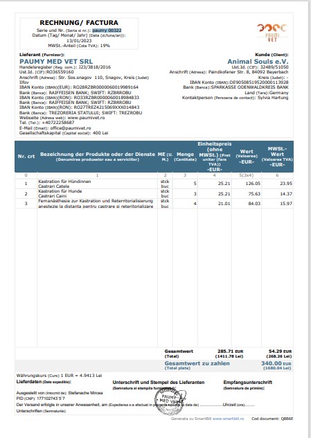 Es wurden daher im Januar 2023 weitere Hunde dort eingefangen und kastriert. Animal Souls e.V. hat einige Kastrationen übernommen. Die Rechnung vom Tierarzt in Rumänien findet ihr als Bild unter diesem Bericht.