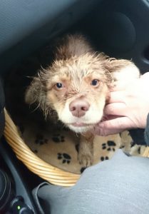 Es ist noch ein gutes Stück zu fahren, als wir durch eine kleine Ortschaft kommen … und plötzlich einen kleinen braunen Hund laufen sehen. Sylvia zu mir: Welpe? … Ich: ja … wir konnten es nicht ganz genau sehen, aber klar war, dass wir hier stoppen mussten. Also schnell rechts ran – auf einer leider gut befahrenen Straße, rechts und links Läden und immerhin Parkbuchten. Wir steigen sofort aus, wechseln die Straßenseite und der Kleine läuft direkt in Sylvias Arme. Definitiv ein Welpe – allein unterwegs! Natürlich muss er mit … eine Box haben wir nicht mehr, also müssen wir wieder ein bisschen improvisieren. Wir holen uns also eins der kleineren Körbchen aus dem Sprinter und der kleine Mann kommt ins Körbchen vor mir in den Fußraum – muss ja auch mal ein Vorteil sein, selbst klein zu sein und kurze Beine zu haben. Der arme Wurm … er ist pitschnass, schlecht mir uns die Hände und schläft dann unterwegs schließlich auch relativ schnell ein. Wie lange er schon im Regen gelaufen ist … so viel Nachholbedarf.