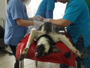 Auch in der Klinik erhalten wir einen super herzlichen Empfang. Wir bekommen eine „eigene“ Dolmetscherin, die uns auch das ganze Klinik-Personal kurz vorstellt und auch die Vorgehensweise und Organisation erklärt. Die Klinik ist wirklich super aufgestellt. Für das Projekt wurde eigens ein größerer Raum mit mehreren Behandlungstischen ausgestattet. Es sind mehrere Tierärzte und Assistenten beschäftigt, jeder hat eine eigene Aufgabe. Die Hunde (und Katzen) werden in den Transportkäfigen vorsediert. Dann werden die Tiere nacheinander für die OP vorbereitet – erst der Zugang gelegt und die Narkose eingeleitet. Dann geht es auf einen der drei OP-Tische, wo die Tiere kastriert werden. Danach werden sie abgelegt bis sie langsam wieder zu sich kommen.