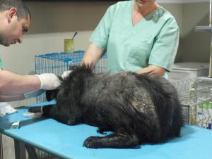 Die erste Anlaufstelle ist der Tierarzt. Bei der Untersuchung zeigt sich nun erstmals das ganze Ausmaß der Verletzung. Sie hat zahlreiche Bisswunden, die wahrscheinlich sogar schon älter sind und sich entzündet haben und eitrig sind. Ein Muskel ist abgerissen und muss womöglich operiert werden. Die arme Maus lässt alles über sich ergehen und wir sind so froh, dass wir noch einmal zu der Stelle zurück gefahren sind, um sie zu holen.