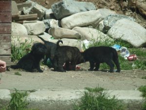 Nur wenige Kilometer weiter kommt uns ein Hund am Straßenrand entgegen. Wir fahren langsam, da es so aussieht als könnte er womöglich gleich über die Straße laufen. Hat er da etwas im Maul? Oder ist das eine Verletzung? Irgendwas ist da …. Wir wenden wieder und halten schließlich auf der anderen Seite, wo mehrere Geschäfte sind. Der Hund ist verschwunden, aber wie es das Schicksal will, entdecken wir mehrere kleine schwarze Welpen. Einige Meter hinter uns steht die Polizei … glücklicherweise nicht wegen uns.