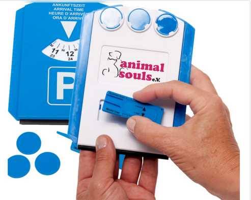Praktische Parkscheibe mit Animal Souls e.V. Logo mit drei in der Rückseite eingeklipsten Einkaufswagen-Chips sowie einem praktischen Reifenprofil-Prüfer.